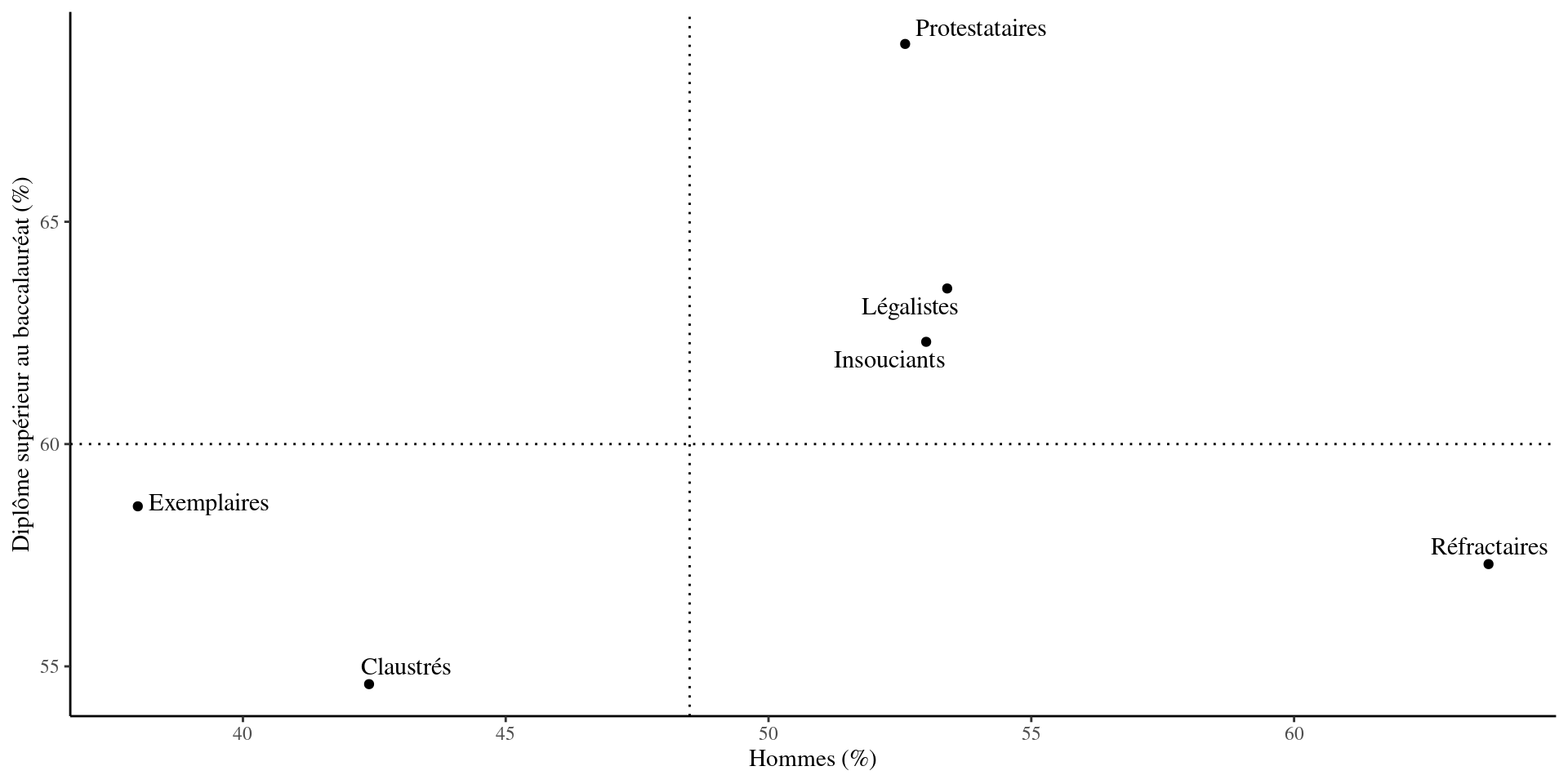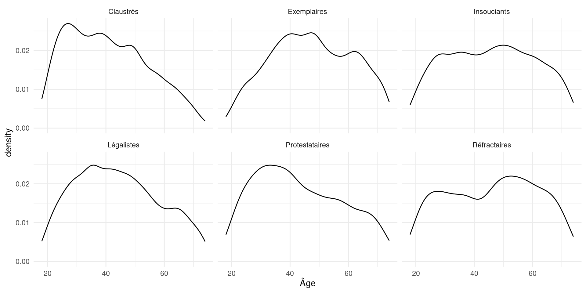 | Ensemble | Claustrés | Exemplaires | Insouciants | Légalistes | Protestataires | Réfractaires | |